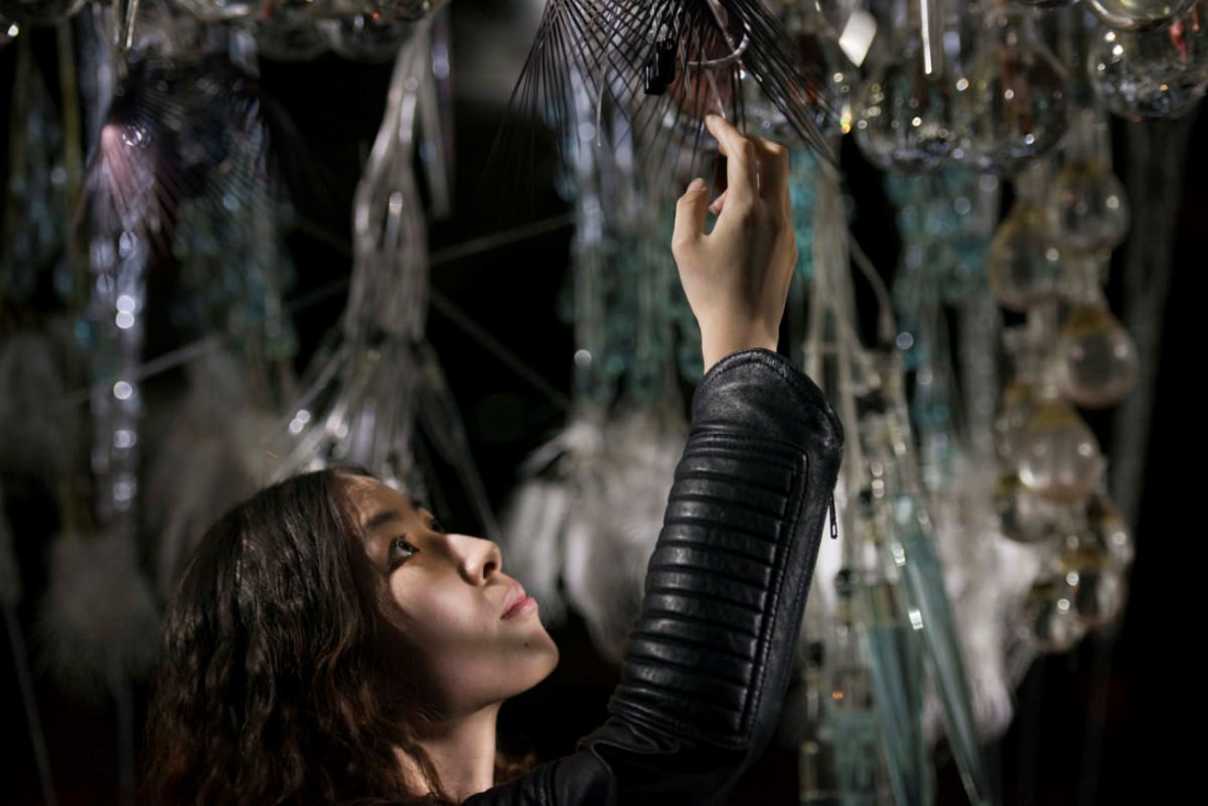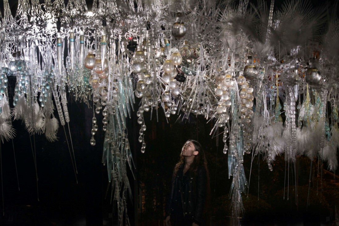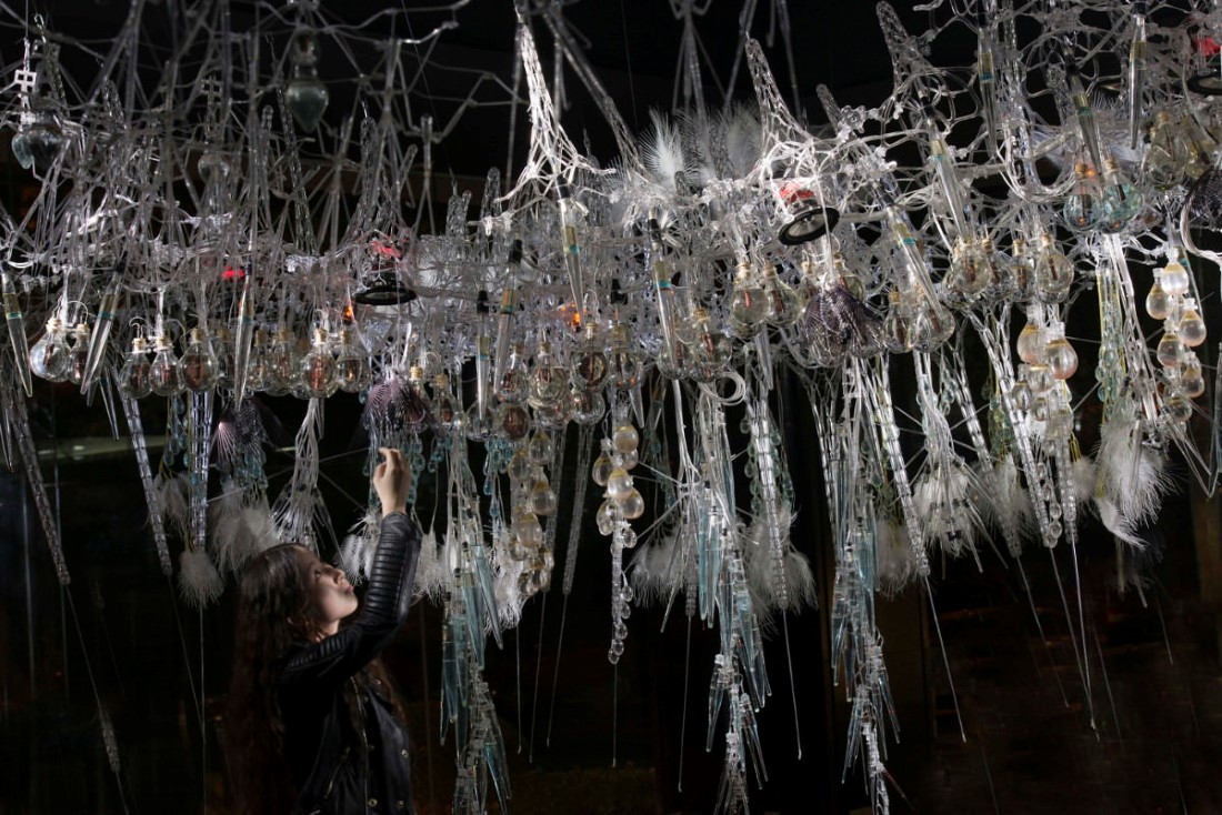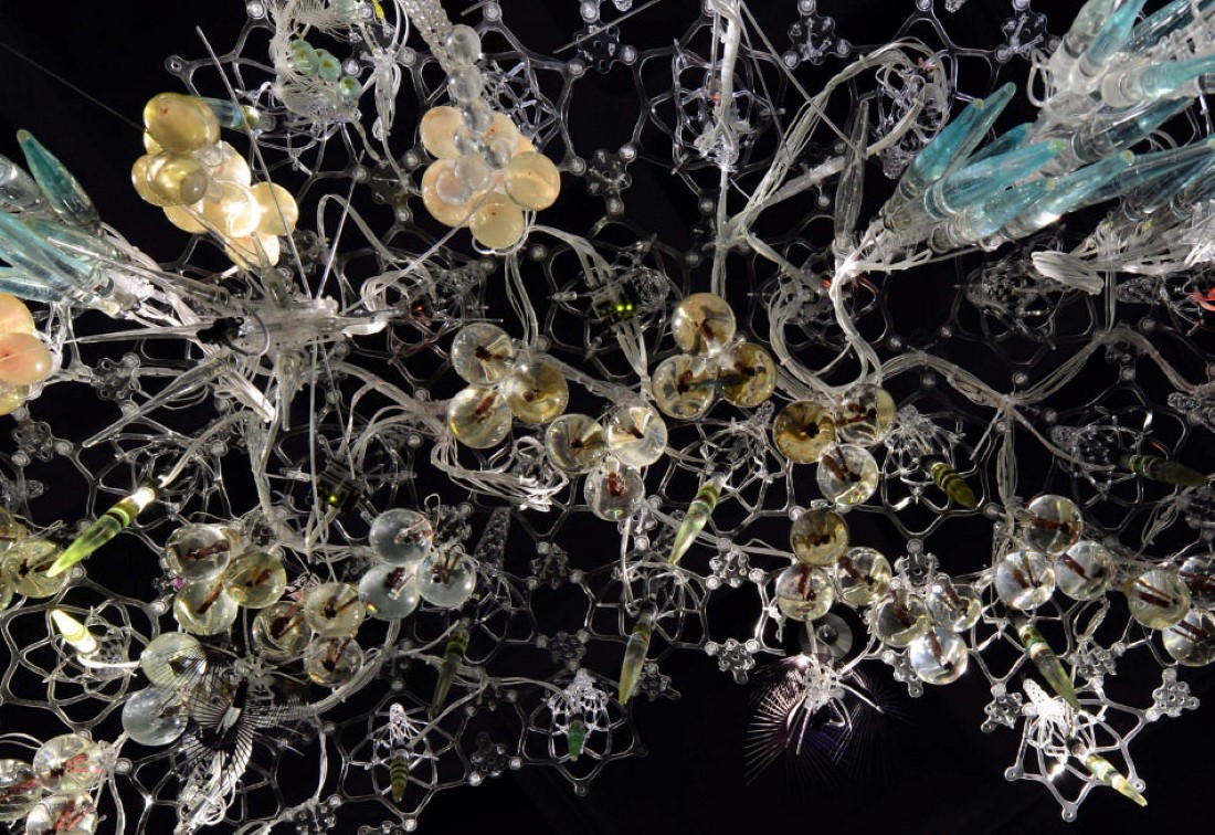 Epiphyte Spring integrates interactive soundscapes and lighting that immerse the audience in an intimate experience, drawing the artwork, space and individual together. Soft rolling waves of light controlled by arrays of microprocessors and proximity sensors are integrated within glasswork layers. Visually stunning qualities are overlaid through dense masses of glasswork vessels and lightweight component arrays. During the day, visitors interact with the sculpture, triggering waves of light and distributed sound. At night, the work becomes a dynamic beacon, illuminating the interior and walkway for the public.