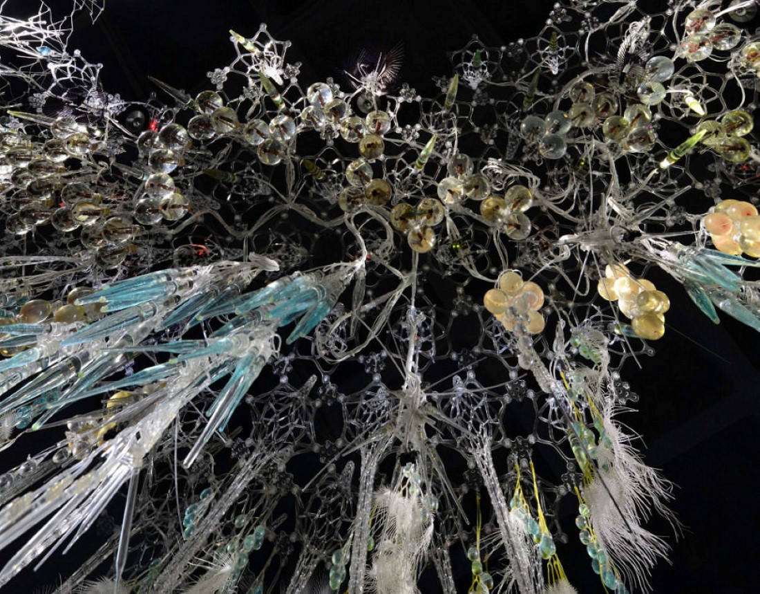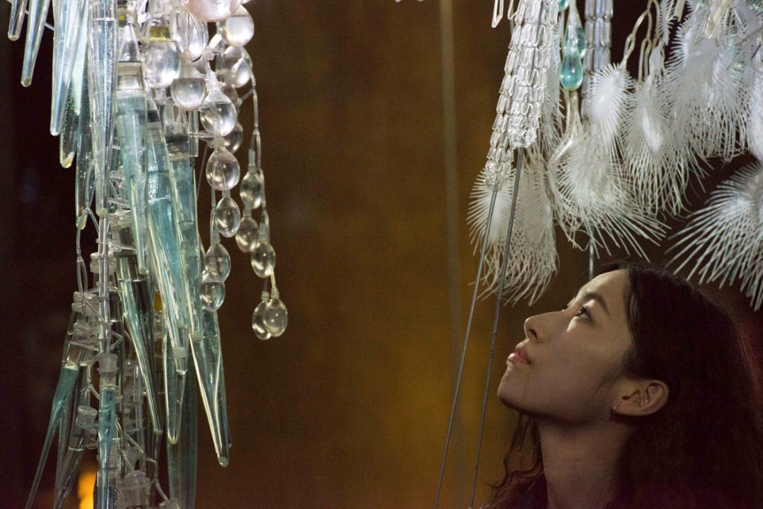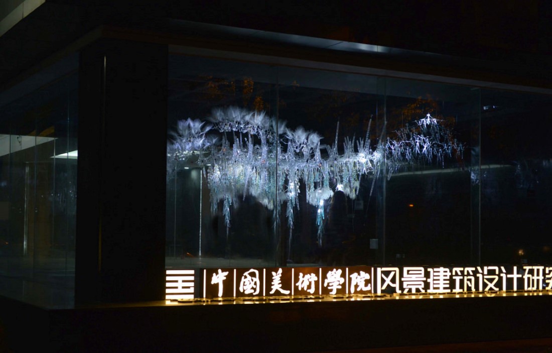 Epiphyte Spring is installed in the Design Institute of Landscape and Architecture, China Academy of Art. The work is composed of transparent acrylic, flexible silicone and custom-fabricated aluminum hardware. The extremely lightweight, durable sculpture functions as a permanent, interactive installation within the architectural space.