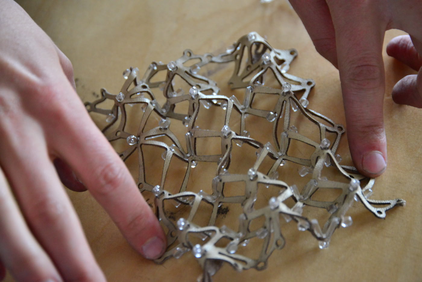 Philip Beesley and radical fashion designer Iris Van Herpen extended their longstanding collaboration, with Beesley’s contributions to ten dresses from her new Magnetic Motion collection, presented at Centre Pompidou for Paris Fashion Week on September 30. Supported by advanced computational modeling and industrial design, the collaborators’ innovative designs combine precisely detailed polymer, crystal and leather components into interlinking three-dimensional fabric structures with striking qualities of flexibility, sparkle and transparency.