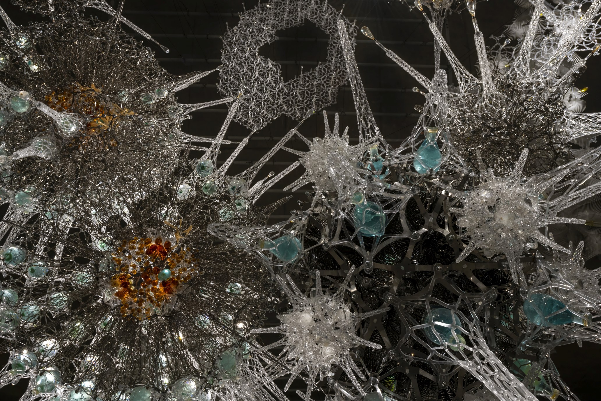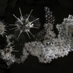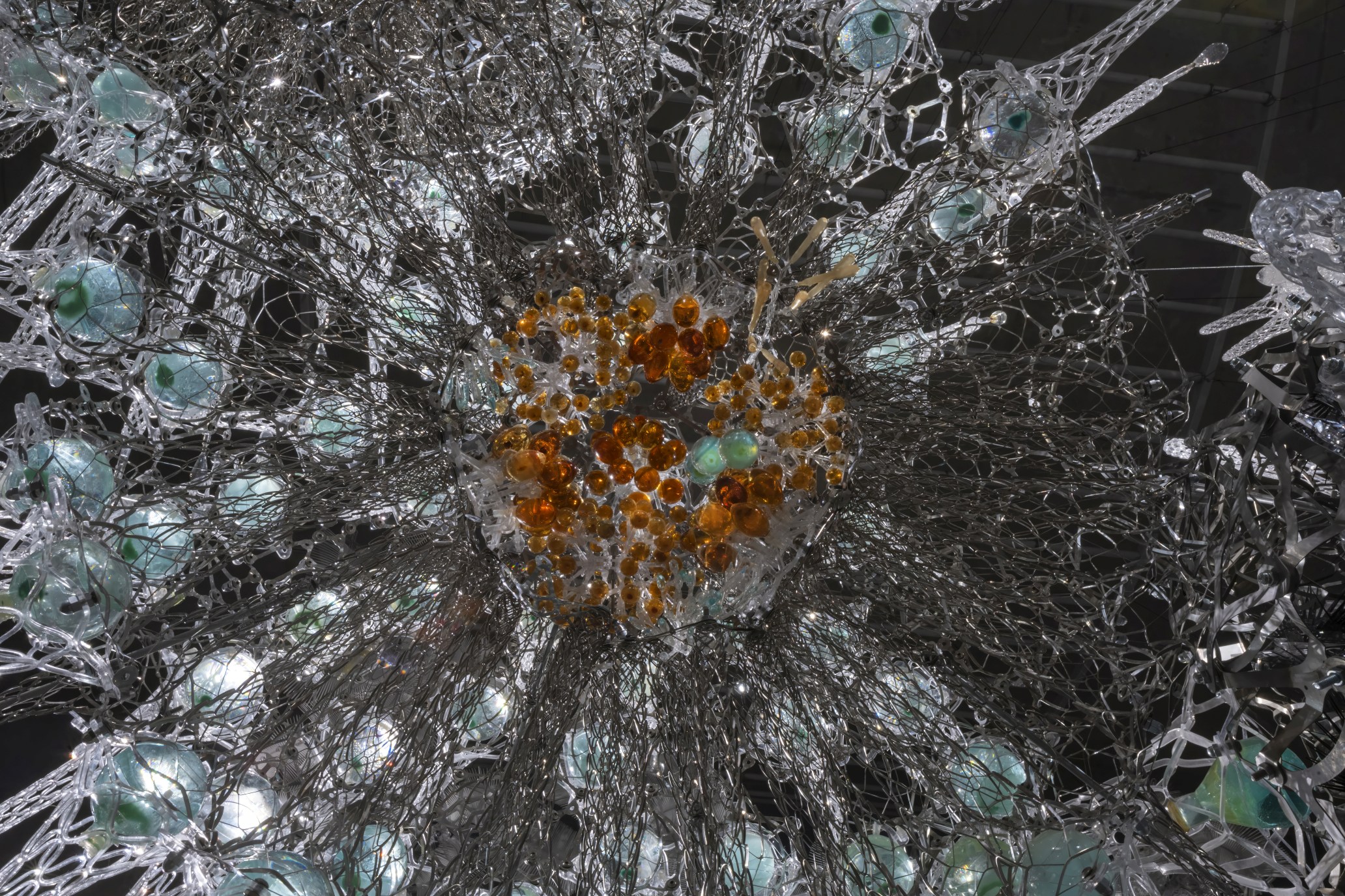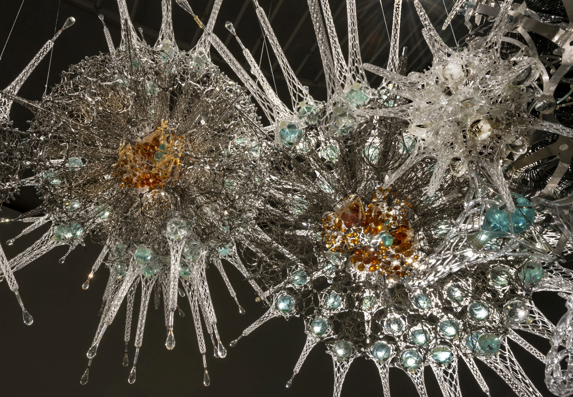 The sculpture was fabricated by combinations of handwork and multiple small-scale laser cutters and traditional machining within the artist’s Toronto studio. Materials include expanded stainless steel, glass, fluid-filled vessels, and innovative thermally formed polymer transparent forms. These interwoven components are all suspended on lightweight aircraft cable suspension rigs.