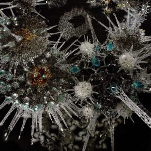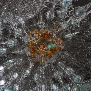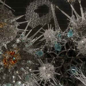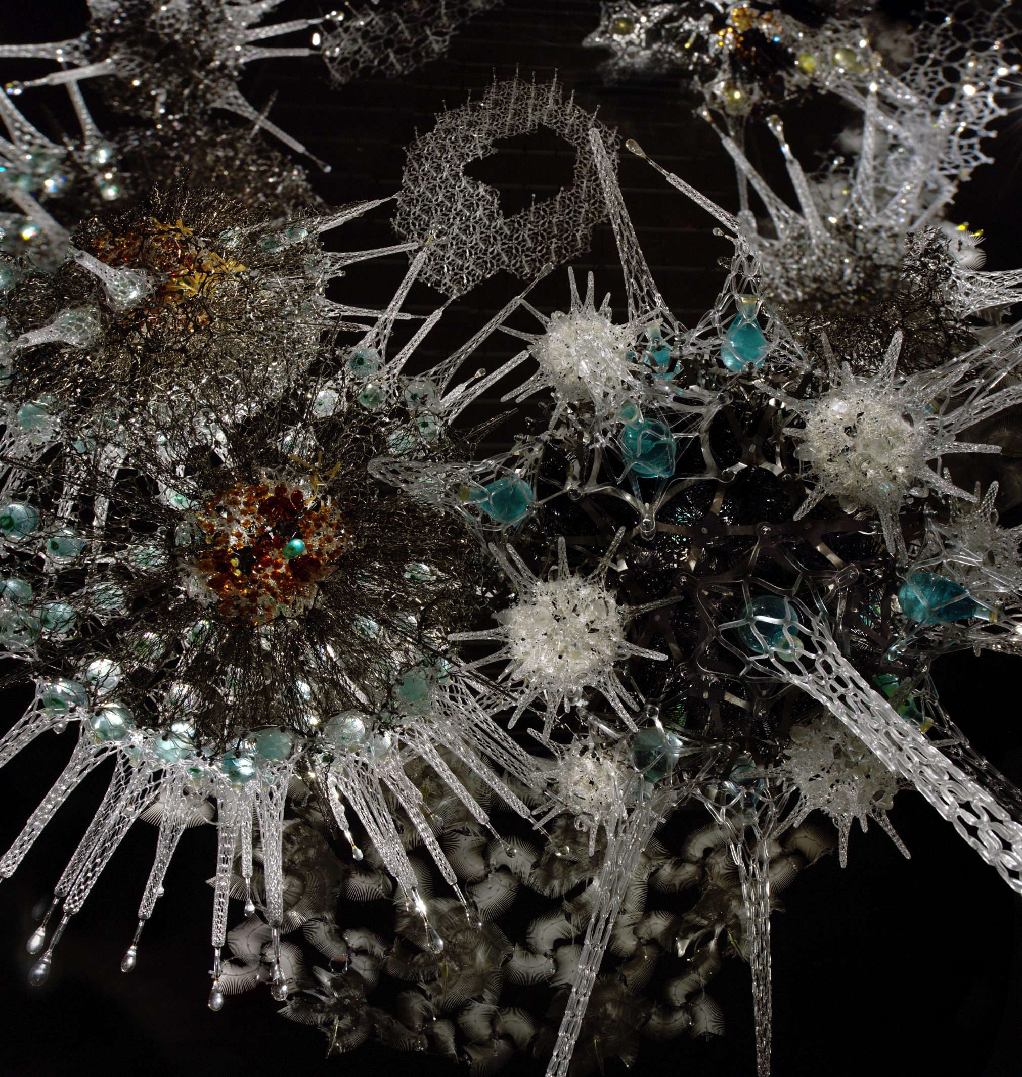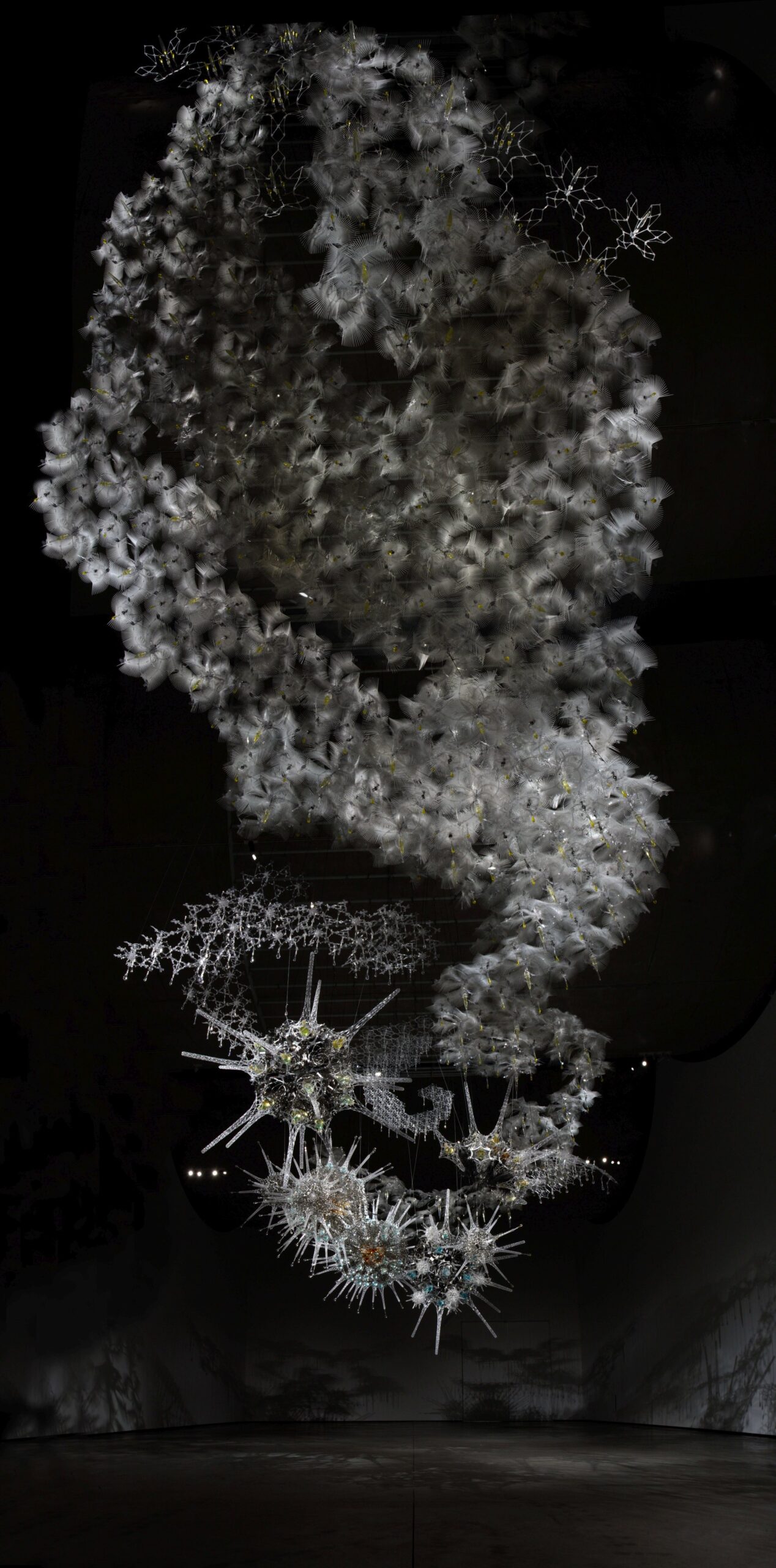 The sculpture was fabricated by combinations of handwork and multiple small-scale laser cutters and traditional machining within the artist’s Toronto studio. Materials include expanded stainless steel, glass, fluid-filled vessels, and innovative thermally formed polymer transparent forms. These interwoven components are all suspended on lightweight aircraft cable suspension rigs.