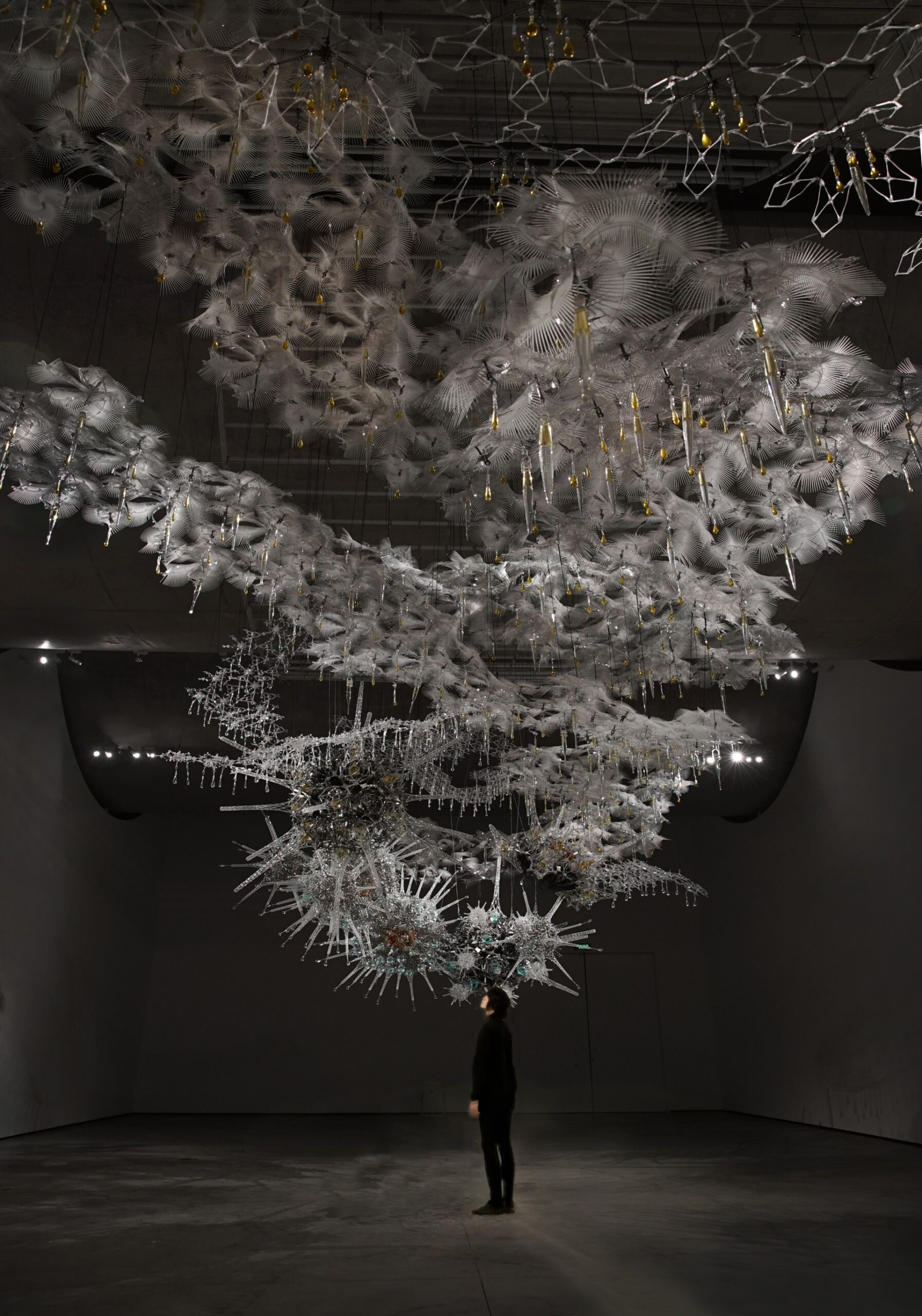 Constellation offers a soaring, undulating canopy of luminous lace-like clouds embedded with liquid-filled protocell glass vessels. The clouds surround a suspended beacon-like central cluster of radiant spherical sheltering nest forms. The delicate materials hover, reaching up high and creating delicate shadows. Deeply fragmented vibration-like filamentary forms are interwoven with shimmering, hopeful light.